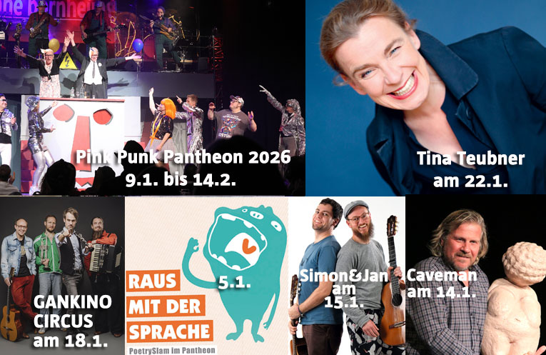 Aber auch neben der rheinischen Kultrevue Pink Punk Pantheon hat der Januar im Pantheon ein Füllhorn an Abendunterhaltung zu bieten: mit einer neuen Ausgabe des "Raus mit der Sprache"-PoetrySlams der kreativ, unterhaltsam und höchst amüsant zum Wettstreit der modernen Dichter lockt startet am 5.1. der Pantheon-Programmreigen 2026.