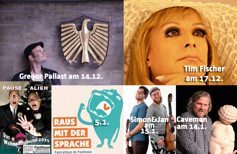 Zu den Höhepunkten im laufenden Pantheonprogramm zählt natürlich das kabarettistische „Weihnachtsspezial“ der Lokalmatadoren Rainer Pause und Norbert Alich am 13.12., 18.-20.12., 26.+27.12. - jeweils um 20 Uhr, - Sie dürfen gespannt sein, was ihre Alter-Egos „Fritz und Hermann“ dieses Mal so alles Heikles anpacken, einpacken und auspacken, der General-Anzeiger zeigte sich in jedem Falle begeistert von der Premierenvorstellung: "eine Klasse für sich, ein vertrautes wie verlässliches Kabarett-Kontinuum."