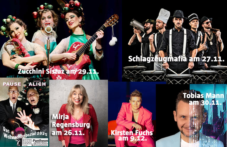 Weitere Höhepunkte im November bilden mehrere Bonnpremieren. Dr. Lüder Warnken, wird am 20.11. erstmals im Pantheon seine einzigartige Mischung aus „Meditainment“ und Comedy präsentiert. Er ist der Notarzt, dem die Patienten vertrauen. Um Ihre Gesundheit geht es ebenso humorvoll am 25.11., wenn Frederic Newnham, alias "Der Physiopath" sein äußert unterhaltsames und zu gleich erhellendes Solo "Du bist Deine beste Medizin" auf die Pantheonbühne bringt. Virtuoses Musikentertainment der Extraklasse gibt es am 27.11. von der 5köpfigen Schlagzeugmafia und am 29.11. von den swingenden drei Zucchini Sistaz mit ihrer fulminanten Weihnachtsshow.