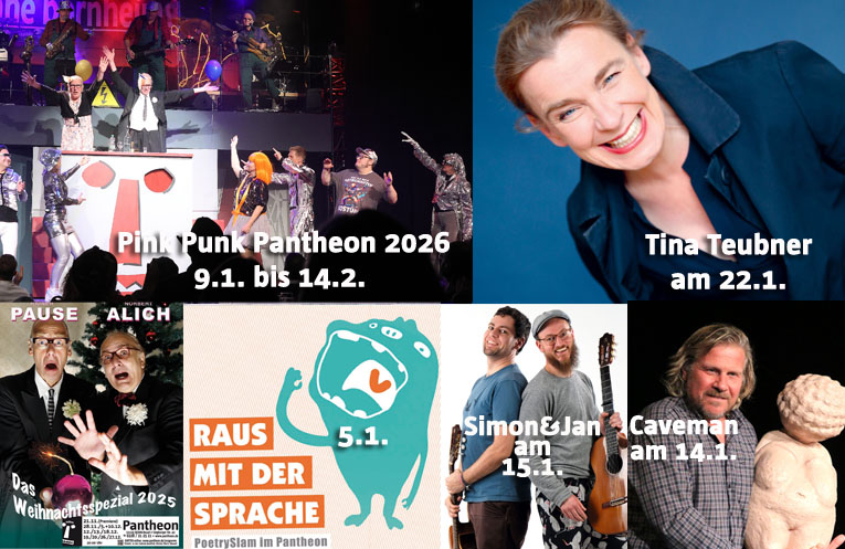 Aber auch neben der rheinischen Kultrevue Pink Punk Pantheon hat der Januar im Pantheon ein Füllhorn an Abendunterhaltung zu bieten: mit einer neuen Ausgabe des "Raus mit der Sprache"-PoetrySlams der kreativ, unterhaltsam und höchst amüsant zum Wettstreit der modernen Dichter lockt startet am 5.1. der Pantheon-Programmreigen 2026.
